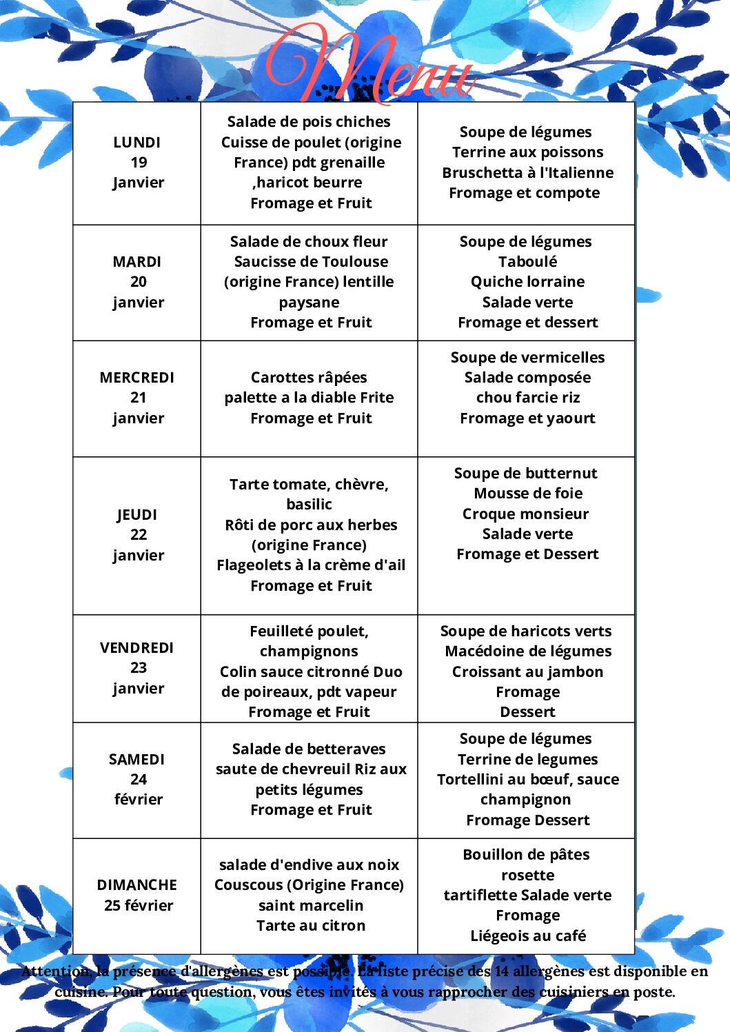 Menu de la semaine